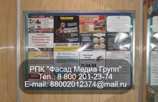 РПК «Фасад Медиа Групп» разместило рекламу в лифтовых кабинах. Рекламное объявление помещено на специальный антивандальный стенд. Период размещения – 15 дней