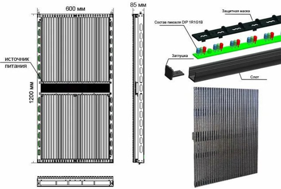 Медиафасад состоит из светодиодных модулей и скрепляющей сетки. В процессе производства медиафасадов используются, как правило, светодиоды типа Direct in-line Package (DIP). Это означает, что один светодиод состоит из трех светодиодов красного, синего, зеленого цветов. Для создания медиафасада требуется большое количество светодиодов, которые крепятся на специальной сетке. Сетка монтируется на здании, обеспечивая устойчивость медиафасада и целостное восприятие изображения. В отличии от медиафасада светодиодный экран устанавливается, как правило, внутри помещения, однако функции выполняет те же, что и медиафасад.