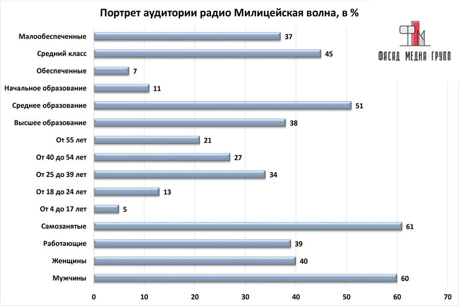 Реклама на радио «Милицейская волна» в Тихвине ориентирована на самый широкий круг людей. Вместе с тем, радиостанция транслирует разный контент, ориентированный на различную публику. Следовательно, рекламодателю необходимо знать целевую аудиторию рекламируемого товара или услуги, чтобы разместить рекламу на радио «Милицейская волна» с максимальным эффектом. В решении данной задачи вам помогут специалисты «Фасад Медиа Групп».