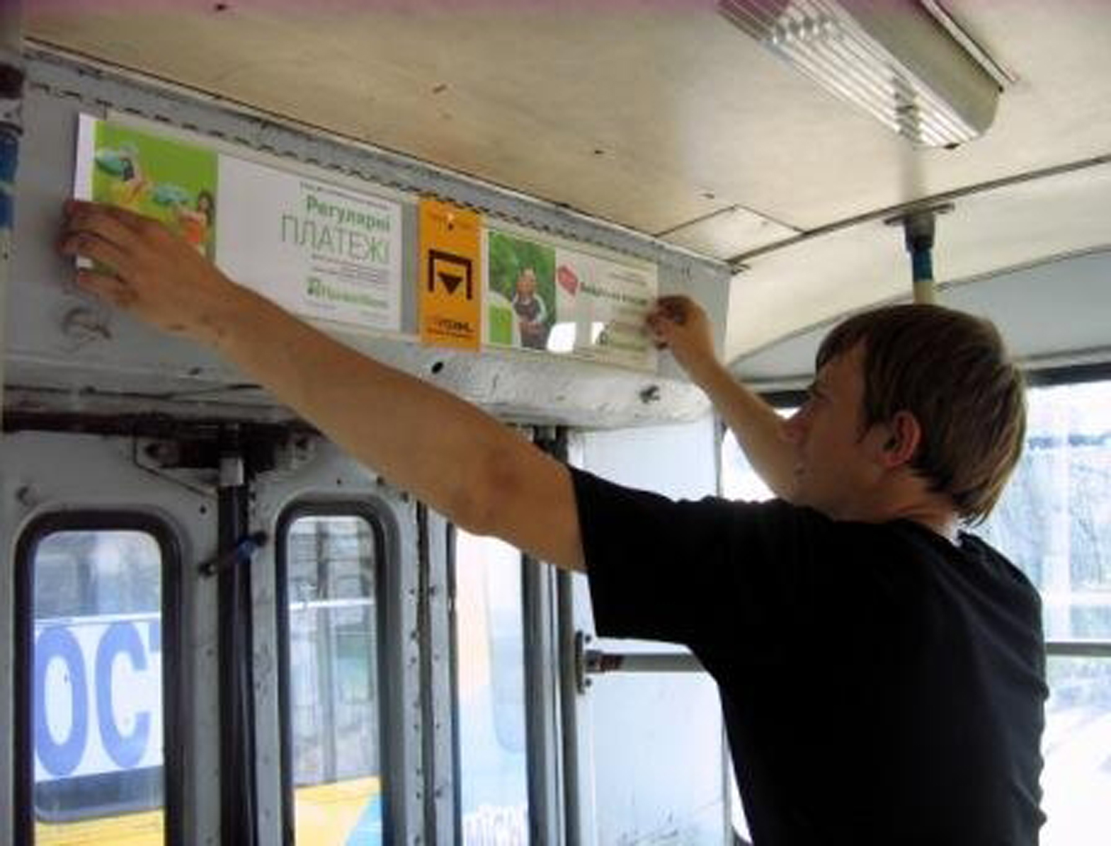 Монтаж рекламы в троллейбусах осуществляется по-разному в зависимости от того, какой рекламный материал и где размещается.