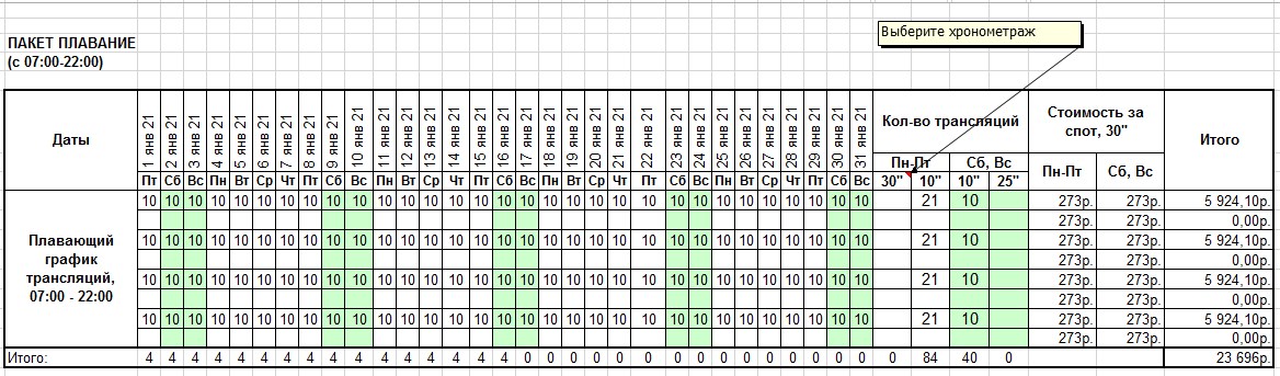 Медиаплан необходим для того, чтобы наглядно увидеть во сколько и по каким дням выходит реклама на телевидении.