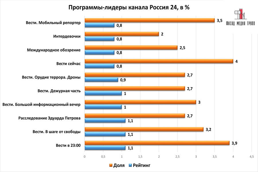 Популярность телеэфира на «России 24» приводит к ежегодному увеличению спроса на рекламное время. Для привлечения клиентов из разных регионов России, увеличения процента продаж, повышения имиджа компании и узнаваемости бренда – размещайте рекламу на «России 24». «Россия 24» – это проверенный и востребованный канал для размещения рекламы на тихвинском ТВ. Для размещения рекламы на телевидении обращайтесь в рекламное агентство «Фасад Медиа Групп». Будем рады сотрудничеству.