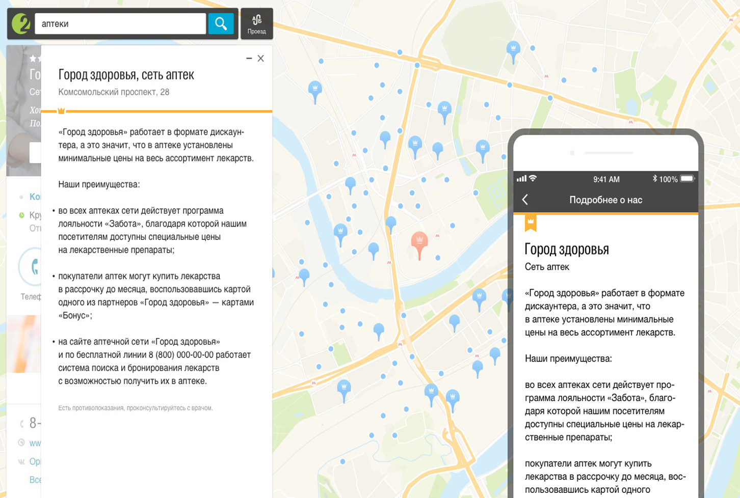 Геоконтекстная реклама видна пользователю в результатах поиска по рубрикам и организациям. Показ геоконтекстной рекламы может зависеть от расположения компании в городе и местоположения (геопозиции) человека, использующего мобильную версию 2ГИС.